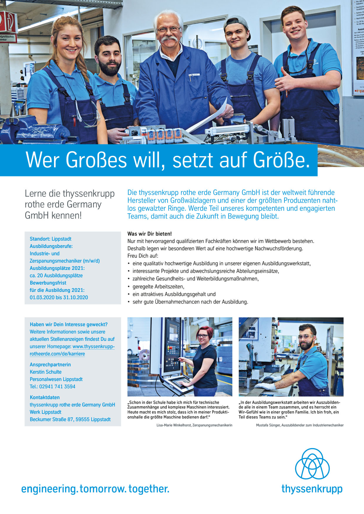 Weitere Informationen sowie unsere aktuell ausgeschriebenen Ausbildungsstellen findest Du auf unserer Homepage unter www.thyssenkrupp-rotheerde.com/de/karriere.