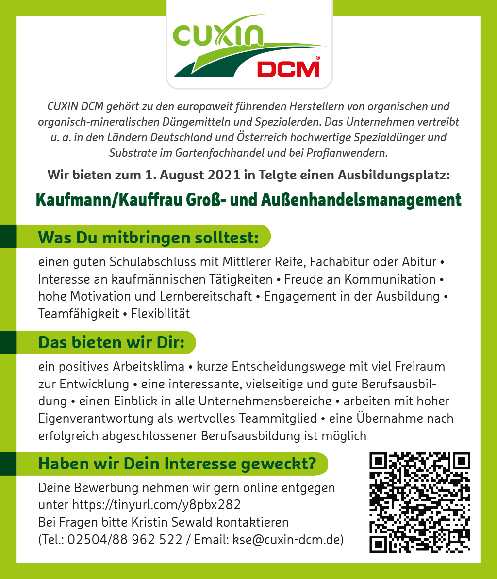 CUXIN DCM gehört zu den europaweit führenden Herstellern von organischen und organisch-mineralischen Düngemitteln und Spezialerden. Das Unternehmen vertreibt u. a. in den Ländern Deutschland und Österreich hochwertige Spezialdünger und Substrate im Gartenfachhandel und bei Profianwendern.