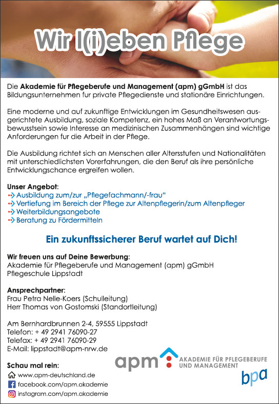 Die Akademie für Pflegeberufe und Management (apm) gGmbH ist das Bildungsunternehmen für private Pflegedienste und stationäre Einrichtungen. Eine moderne und auf zukünftige Entwicklungen im Gesundheitswesen ausgerichtete Ausbildung, soziale Kompetenz, ein hohes Maß an Verantwortungsbewusstsein sowie Interesse an medizinischen Zusammenhängen sind wichtige Anforderungen für die Arbeit in der Pflege. Die Ausbildung richtet sich an Menschen aller Altersstufen und Nationalitäten mit unterschiedlichsten Vorerfahrungen, die den Beruf als ihre persönliche Entwicklungschance ergreifen wollen.