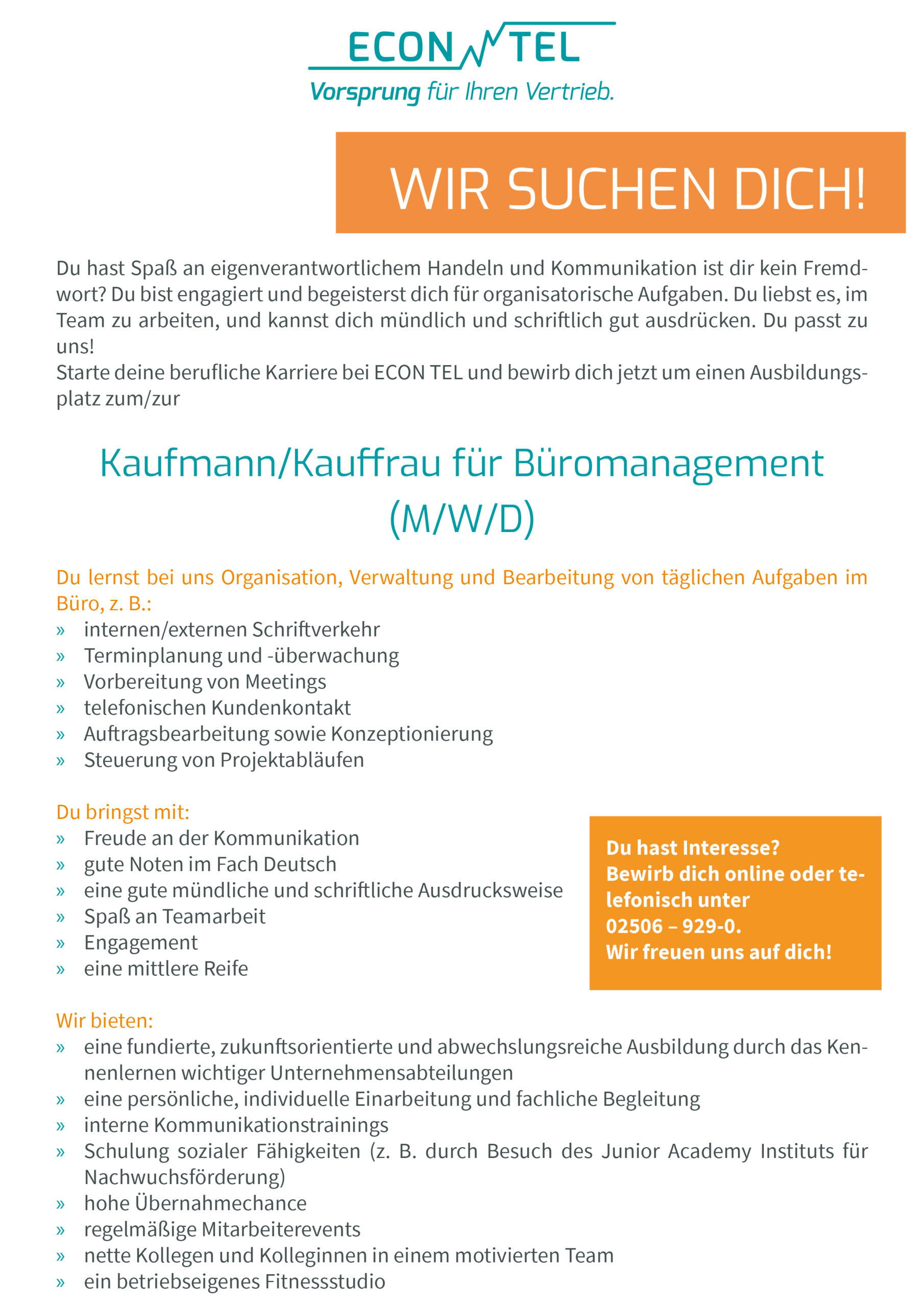 Dann bewirb dich jetzt online oder telefonisch unter 02506 - 929-0.