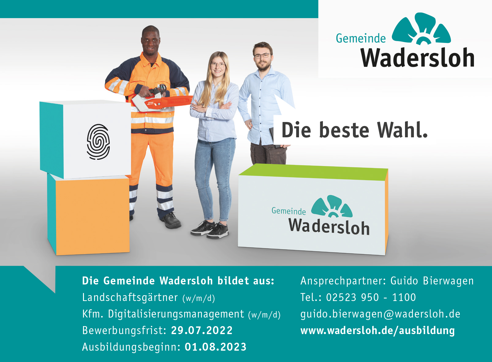 Ansprechpartner: Guido Bierwagen Tel.: 02523 950 - 1100 *protected email* www.wadersloh.de/ausbildung