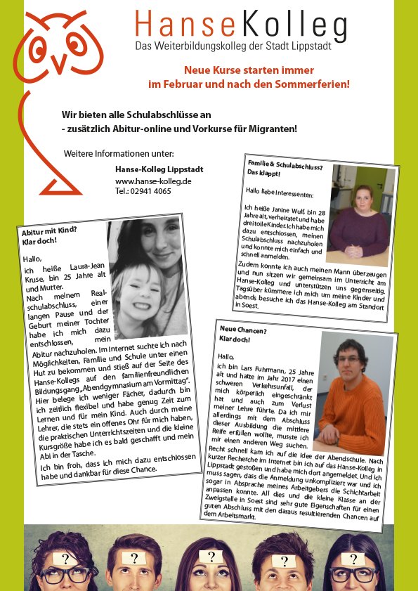Die persönliche Betreuung der Studierenden ist uns ein besonderes Anliegen. Die Lehrerinnen und Lehrer verstehen sich als Begleiter individueller Lernprozesse. Wir unterrichten nach erwachsenenpädagogischen Konzepten in überschaubaren Lerngruppen. Wer sich für das Hanse-Kolleg entscheidet, kann neue Weichen stellen. Geringqualifizierte laufen immer stärker Gefahr, keine Arbeit mehr zu finden. Schlüsselqualifikationen sind von zunehmender Bedeutung. Die an der Schule erworbenen Kompetenzen bereiten gezielt auf die Anforderungen in einer Ausbildungs- und Studiensituation vor. Der Schulbesuch ist auch mit einer beruflichen Tätigkeit vereinbar und wird vom Staat nach dem BAföG gefördert. So muss die berufliche und finanzielle Sicherheit nicht aufgegeben werden.